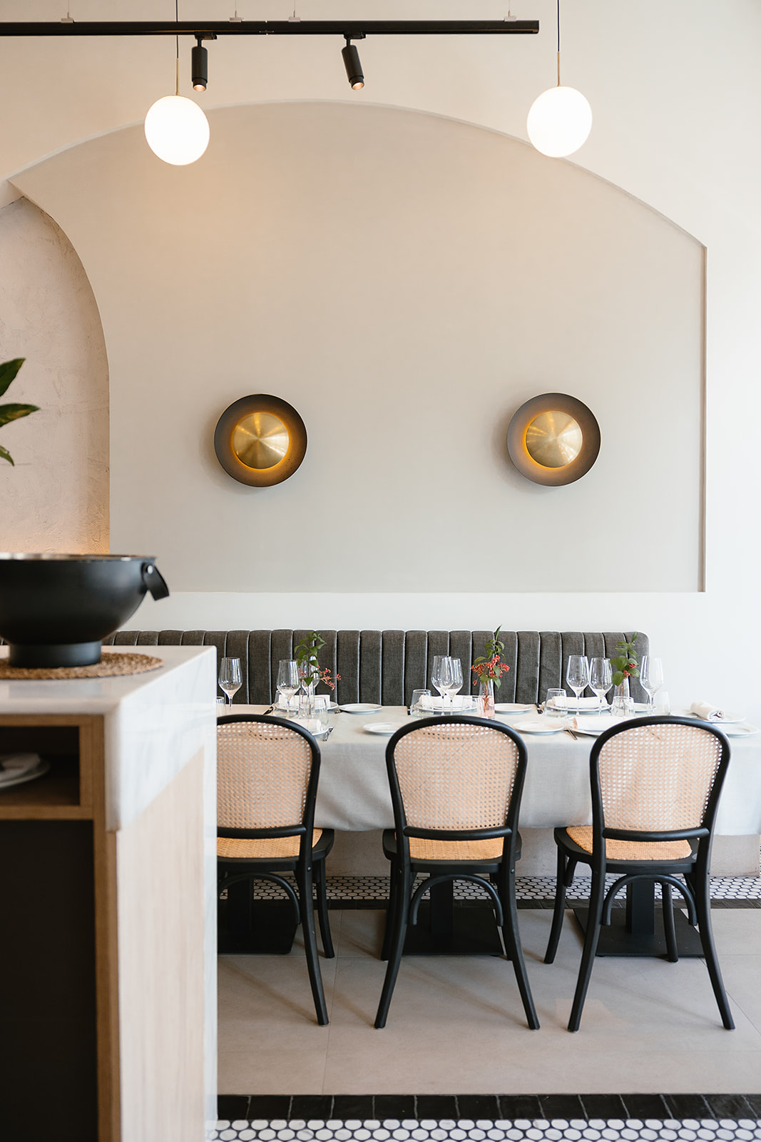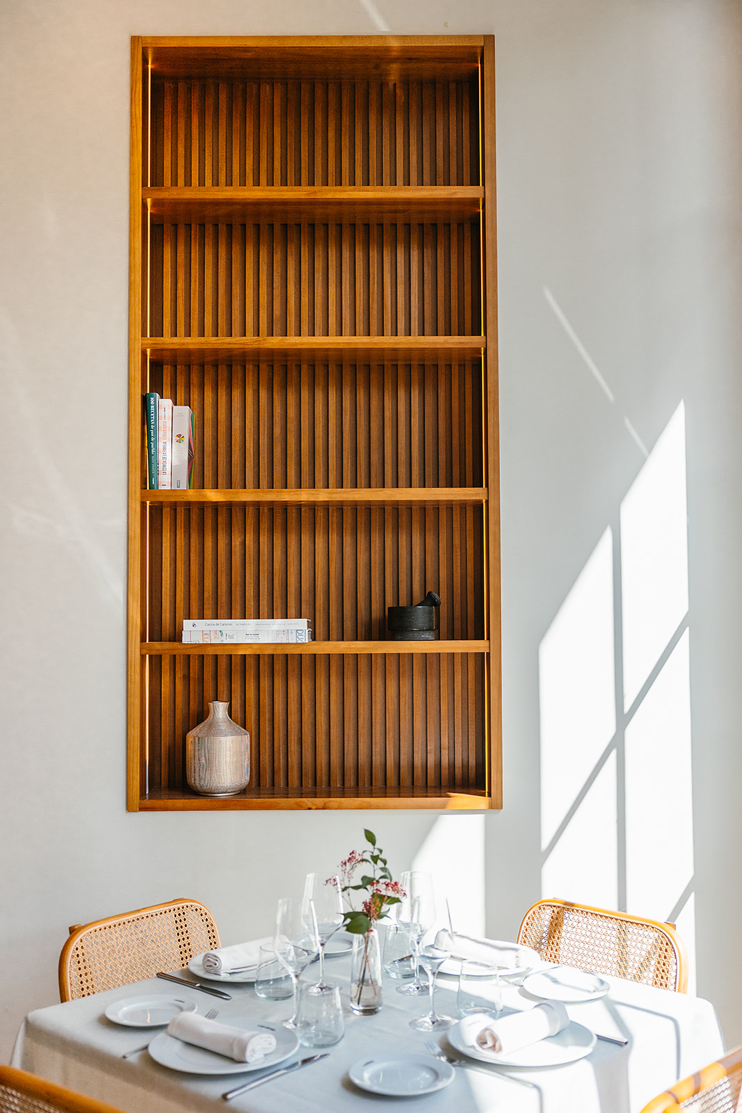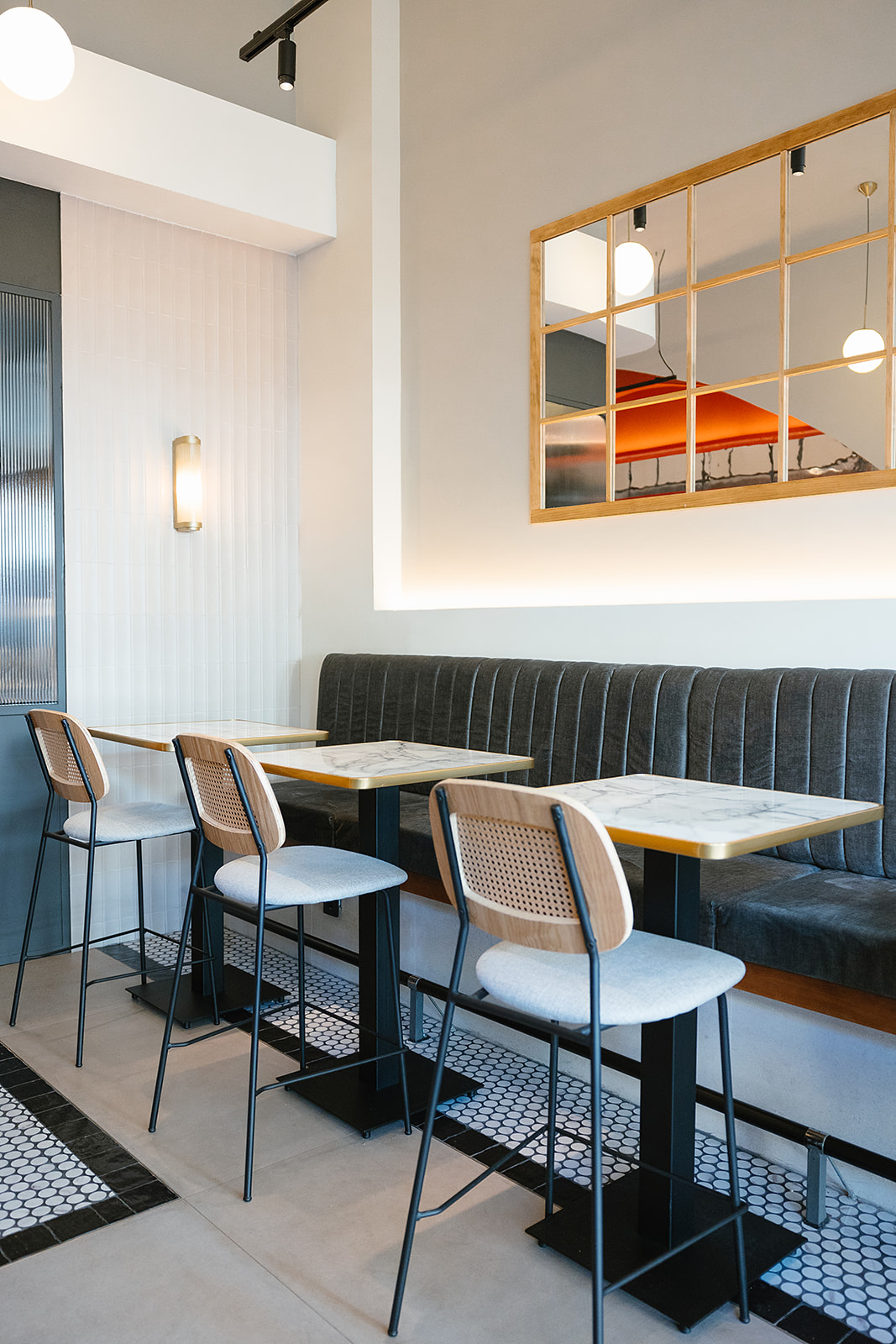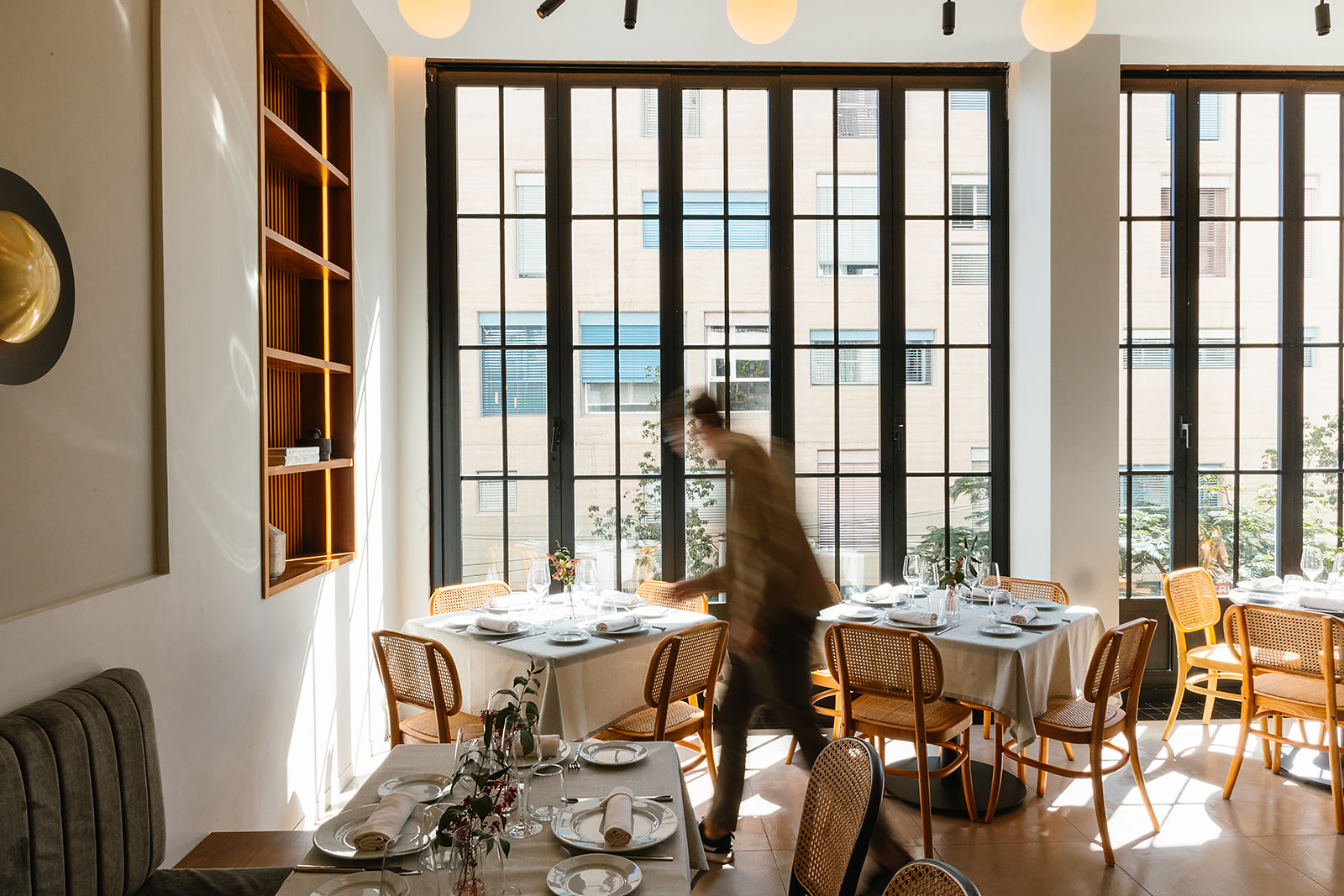 Una casa de comidas de las de siempre: barra, mantel y cocina abierta.